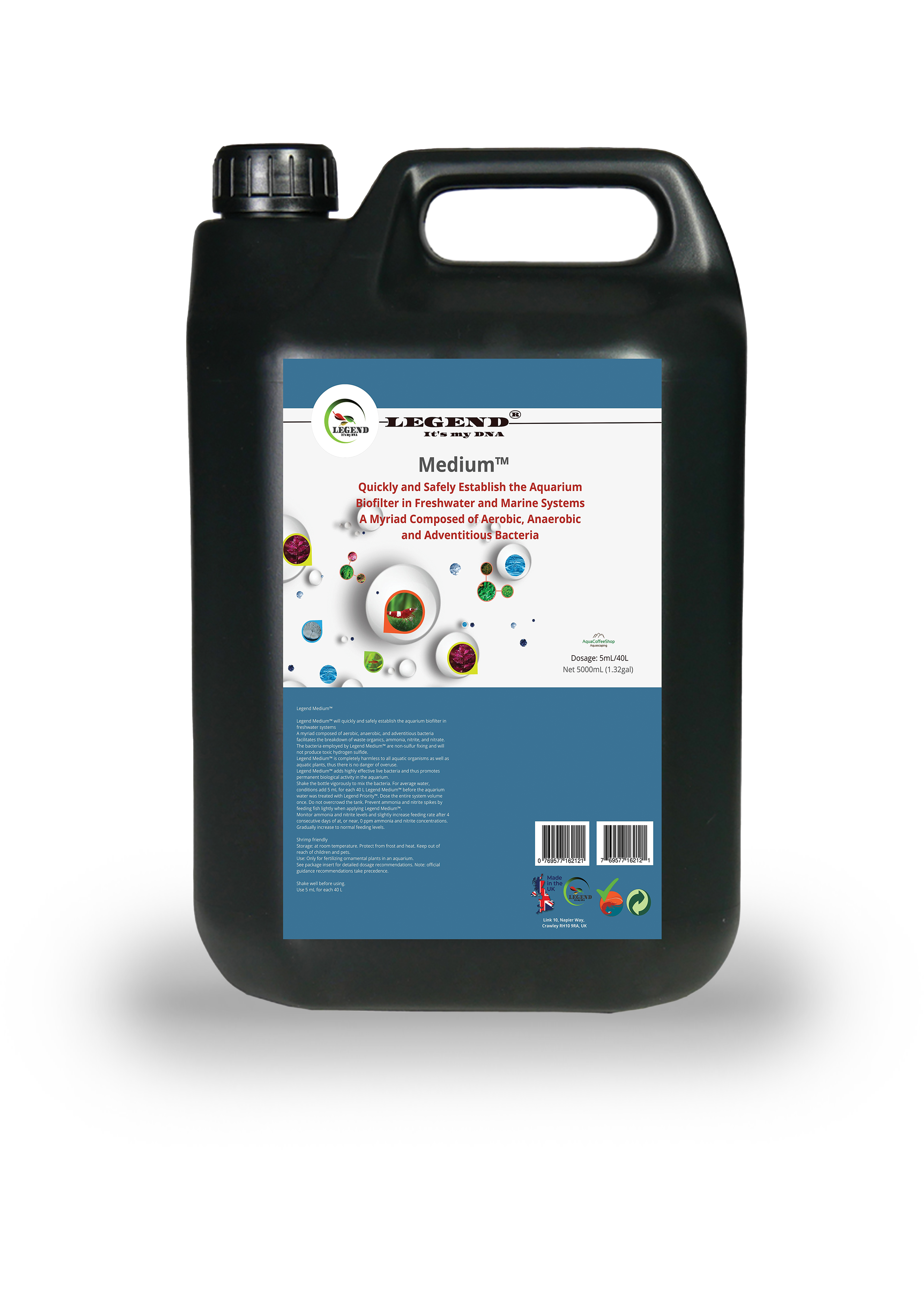 Shake the bottle vigorously to mix the bacteria. For average water, conditions add 5 mL for each 40 L Legend Medium™ before the aquarium water was treated with Legend Priority™. Dose the entire system volume once. Do not overcrowd the tank. Prevent ammonia and nitrite spikes by feeding fish lightly when applying Legend Medium™.